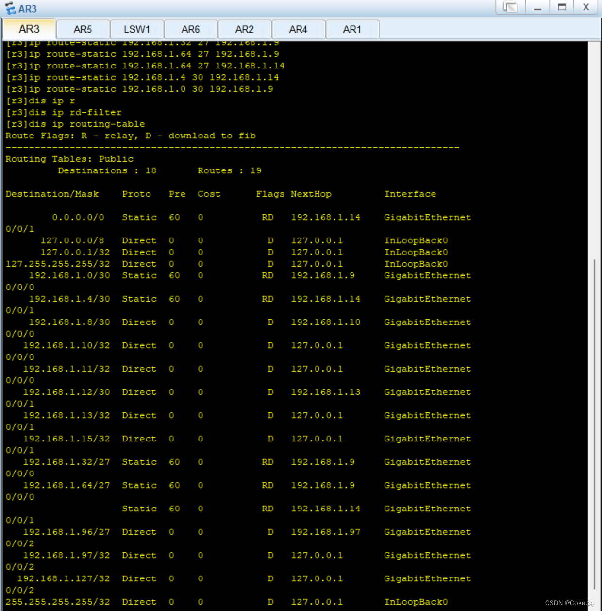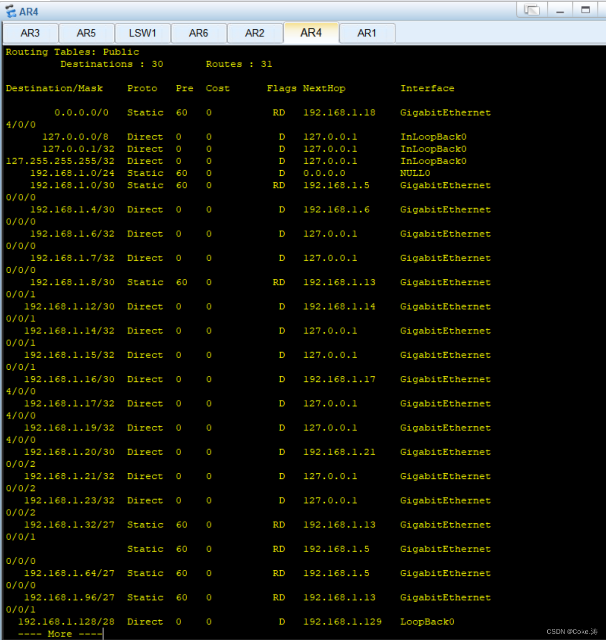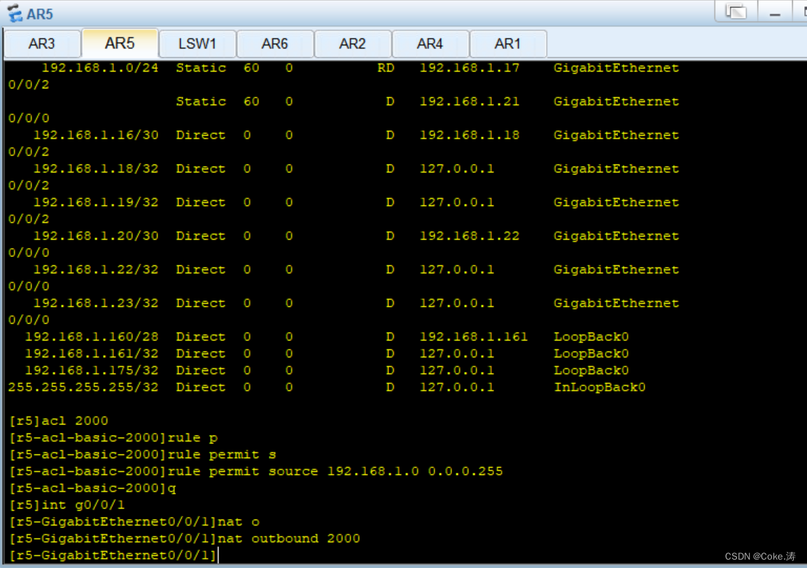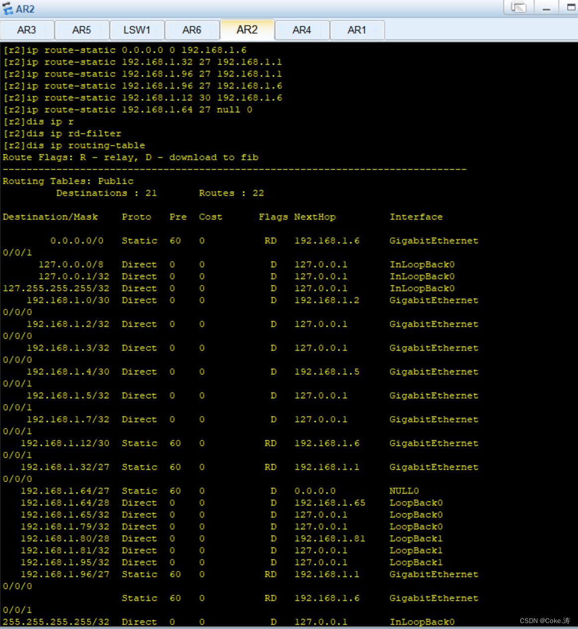 先进行IP地址合理分配,将所需配置IP地址的设备配置完后验证配置好的接口,做完简单的验证后在进行路由的配置:先配置需要缺省路由的设备,IP地址汇总完后再配静态路由,配置完静态路由再将需要防环的路由器进行空接口配置以防止出环。最后对外网进行IP配置,此时全网可通。在次前提下,对需要配置远程登录的设备进行远程登录配置,配置完后按照实验要求进行验证。