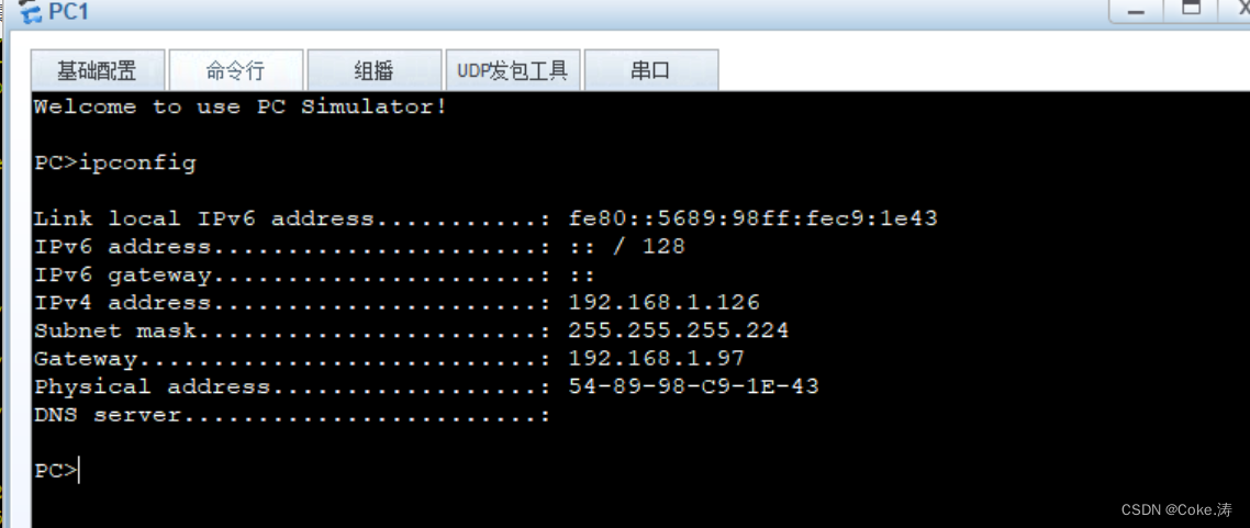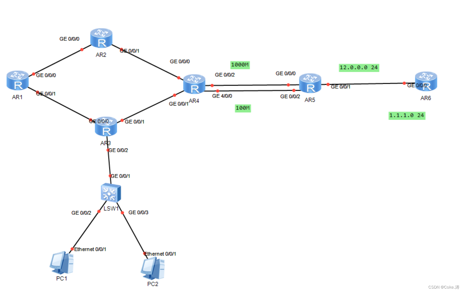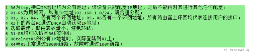 1)首先实验要求是将192.168.1.0/24的网段进行IP地址的划分。根据拓扑结构,我们得知需要划分出6个网段,划分的网段如下: