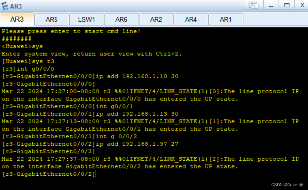 2)选其中6个网段作为实验所需网段,剩余2个网段作为保留网段,在将192.168.1.0/27作为我们的骨干链路的网段,根据拓扑得知我们需要6个网段,划分的网段如下: