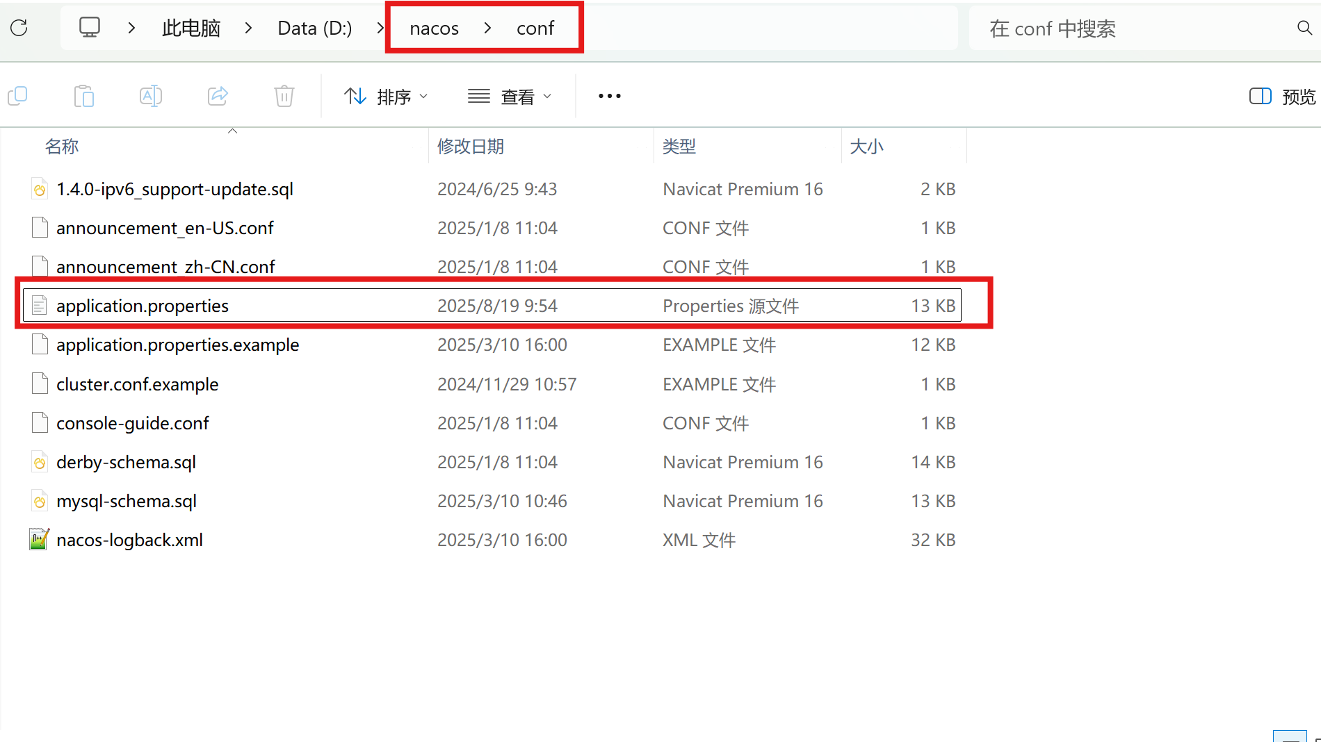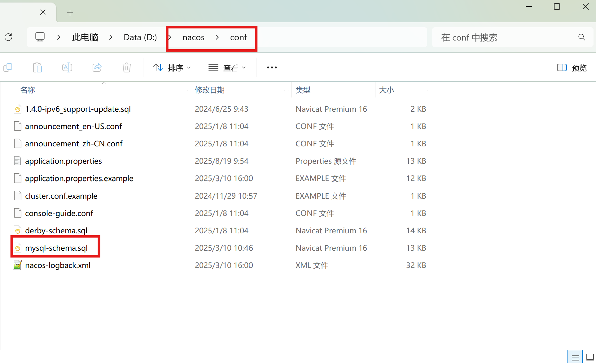 第二步:找到下载好的压缩包,解压成功后找到nacos/conf 目录下的mysql-schema.sql文件