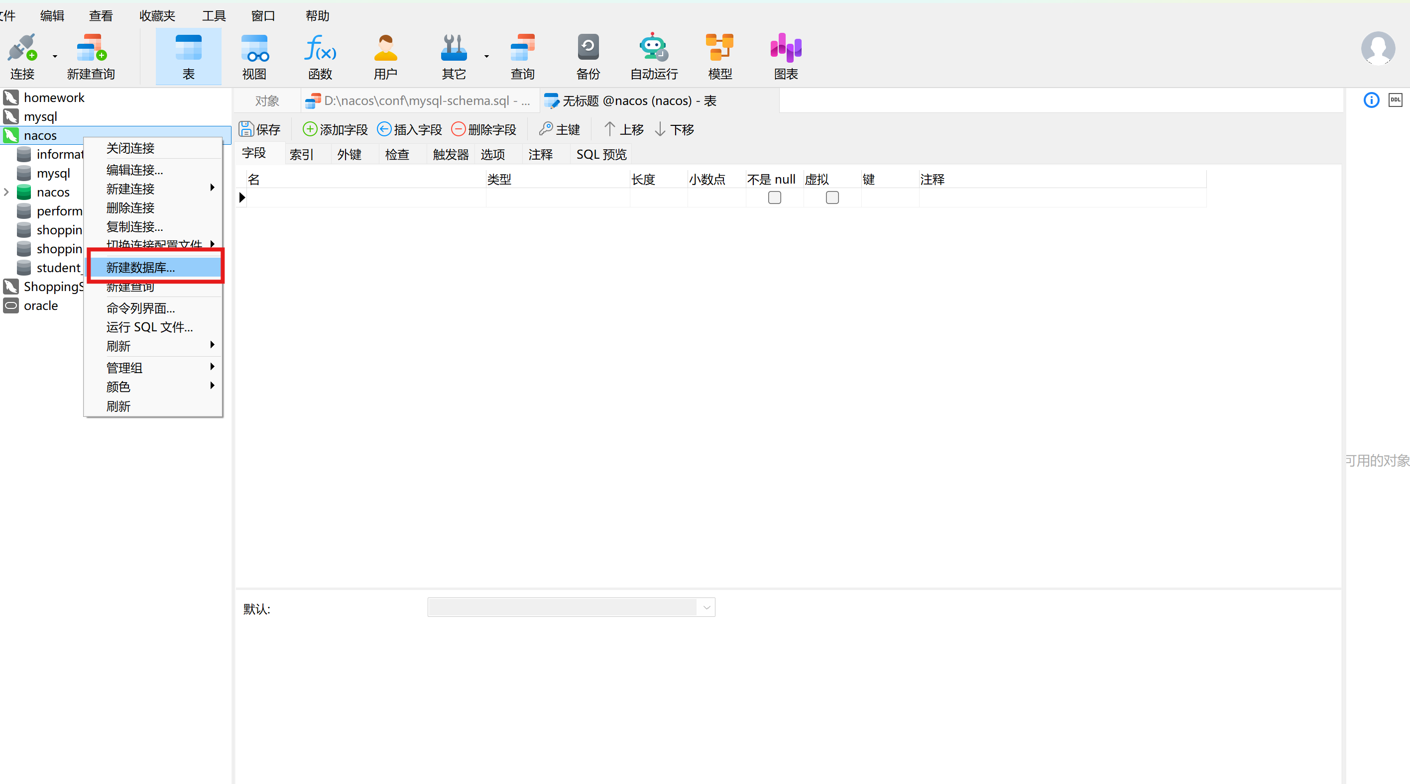 选择一个已经建立好的连接,右击 选择 “ 新建数据库 ” 输入 数据库名为 " nacos " 点击 “确定”