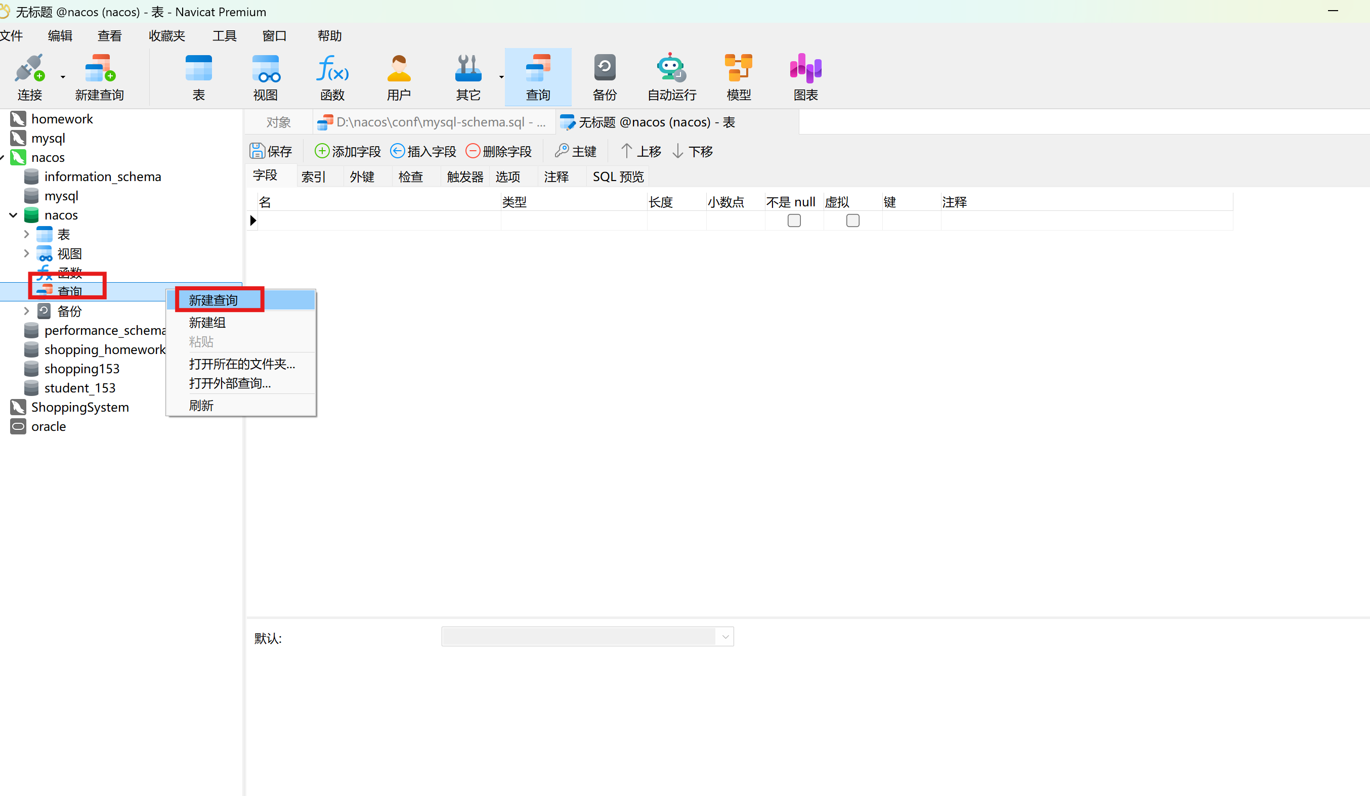 点击nacos 数据库 右击查询 选择 " 新建查询 "