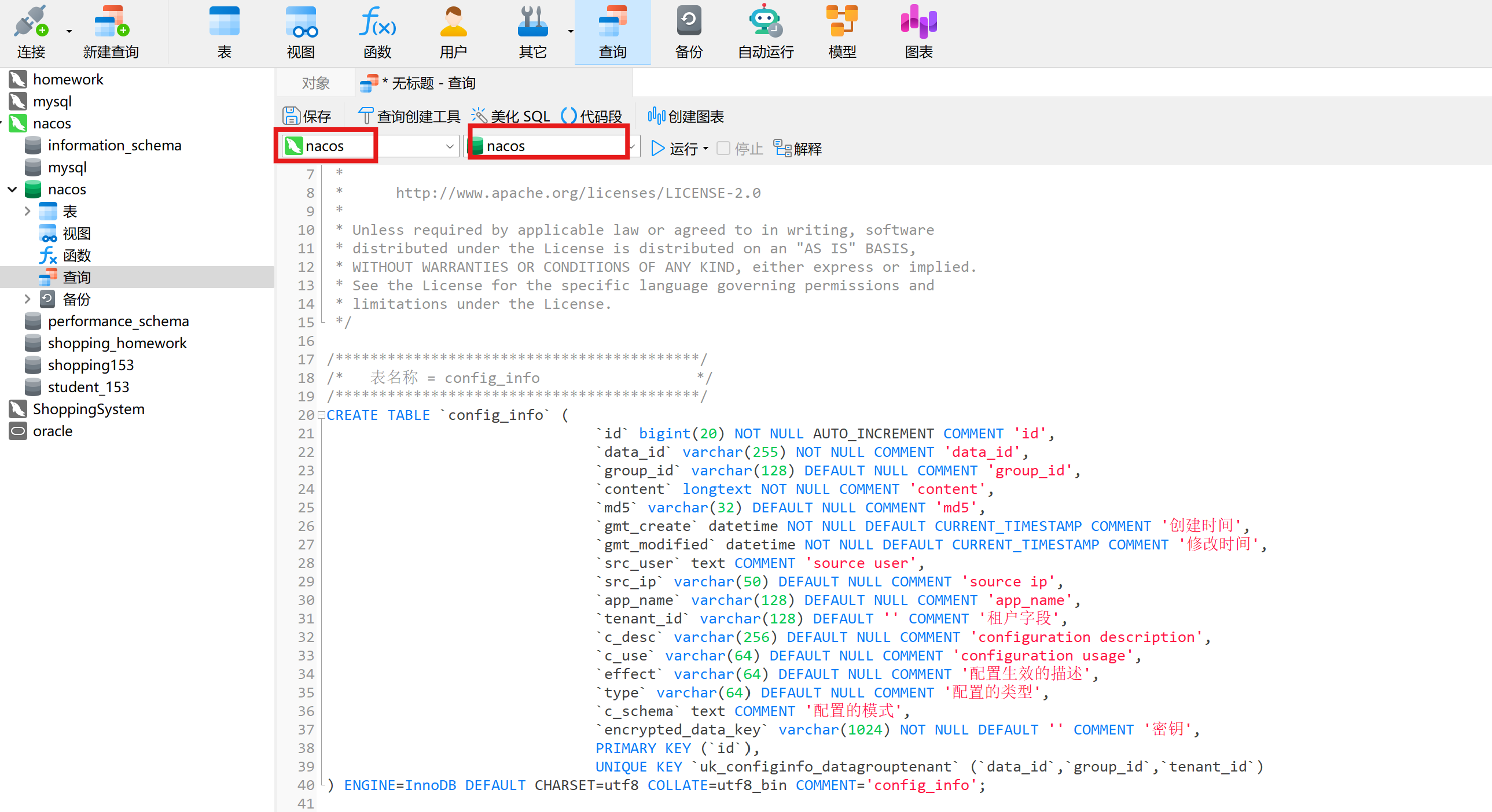 确保是你选择的连接下的 nacos 数据库 下的查询,点击 “ 运行 ” (图片里的红框附近)