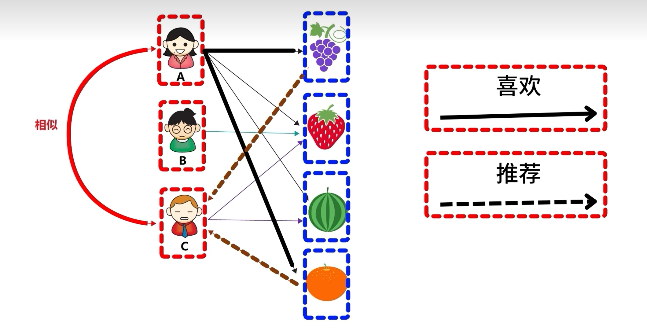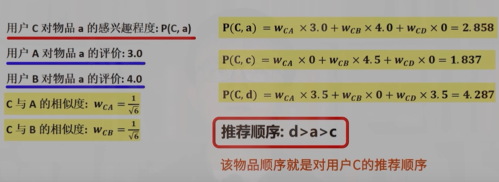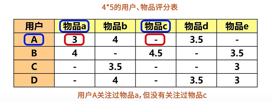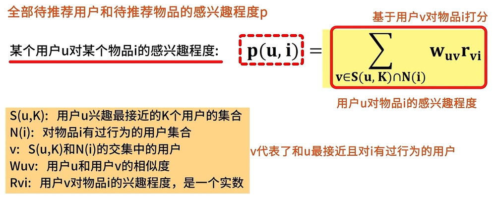 - 选出这些相似用户喜欢的、且目标用户没有关注的物品,将它们推荐给目标用户。