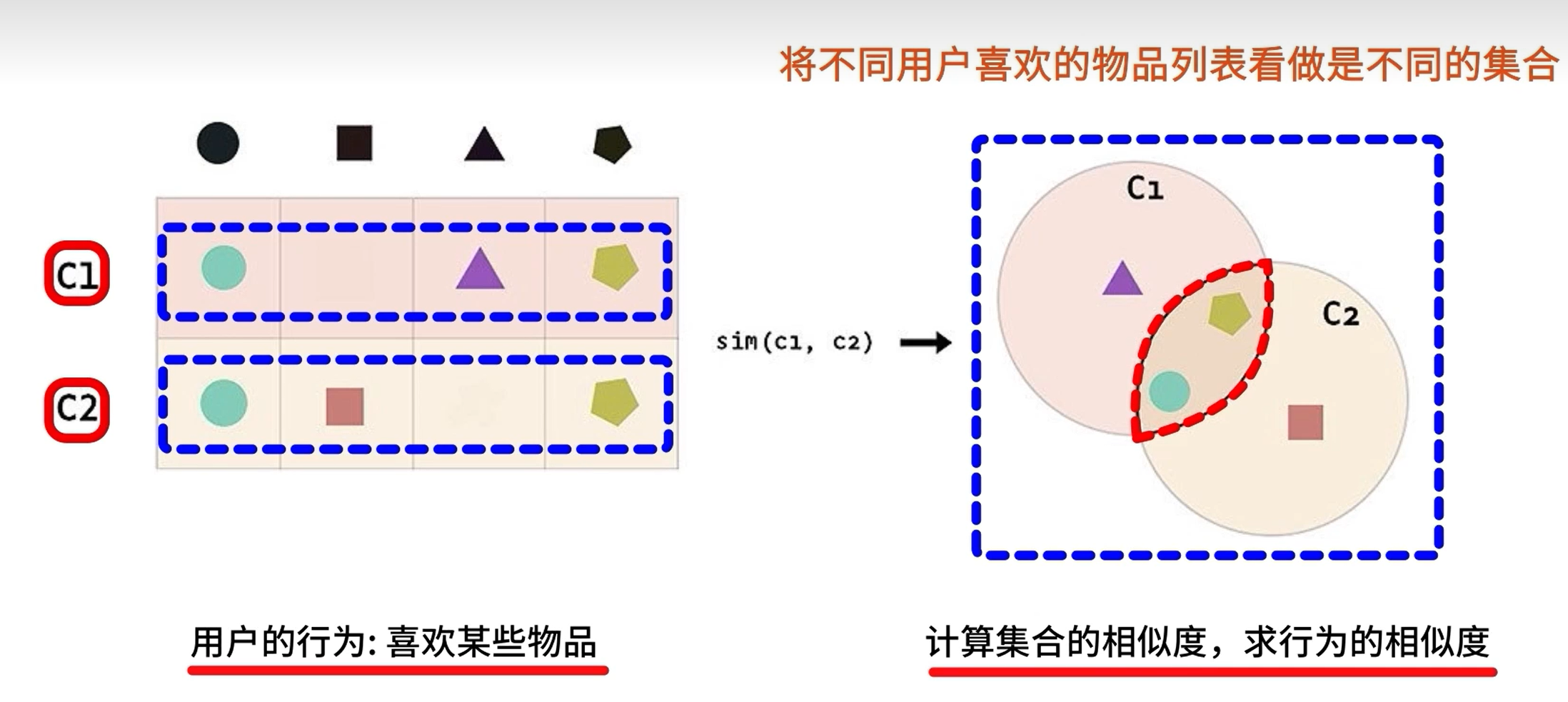 先“找到相似用户”,再“找到他们喜欢的物品”--->人以群分。即,给用户推荐“和他兴趣相似的其他用户”喜欢的物品。