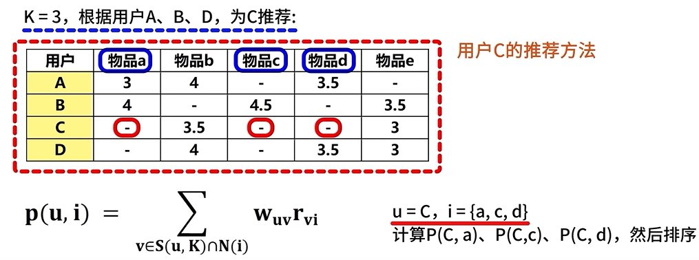 和他兴趣最相似的K个用户的感兴趣物品会对推荐的物品做一个排序