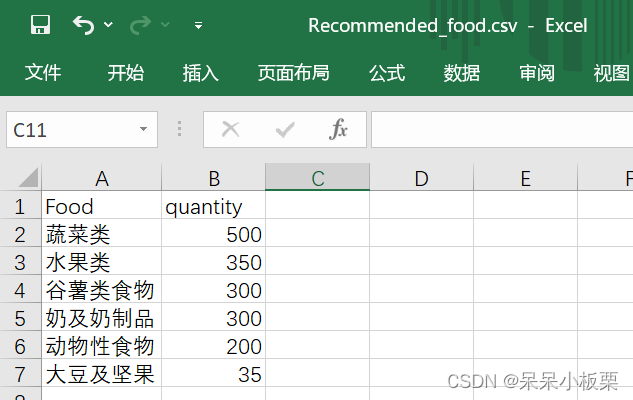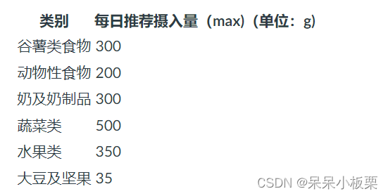 本实验使用《中国居民膳食指南(2022)》中关于每类食物推荐摄入量最大值的数据。数据如下图所示: