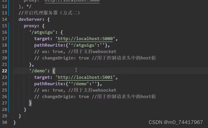 第二种方式可以配置多个代理对象,比如只要你的请求路径里面带有/atguigu就帮你代理转发到5000服务器,只要你请求路径带有/demo就帮你代理转发到5001服务器