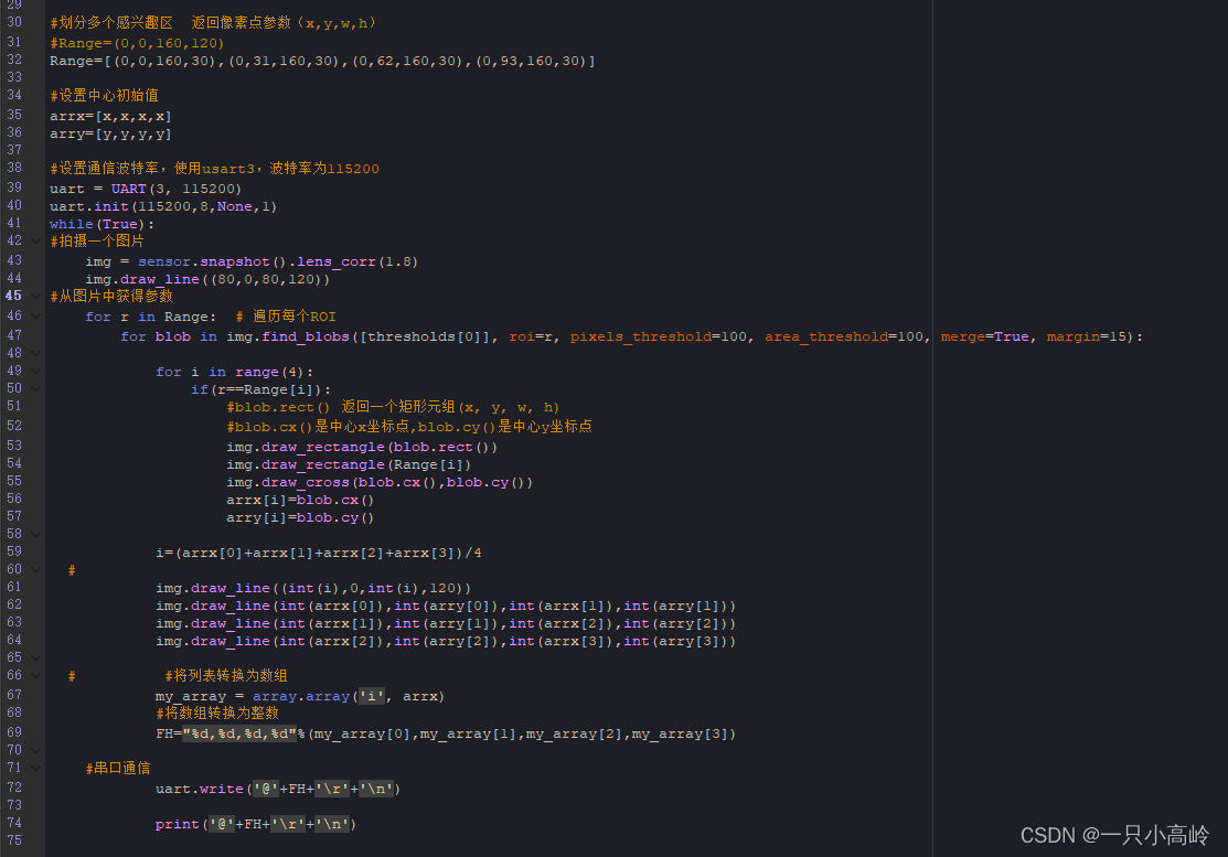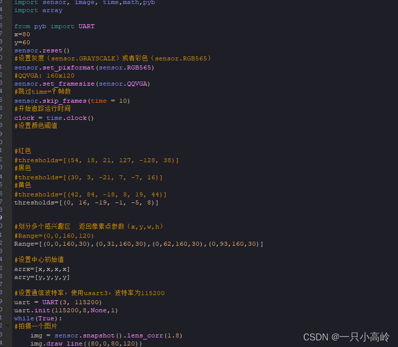 其中,循迹是使用的openmv示例代码,寻找色块的源代码加上串口通信的代码