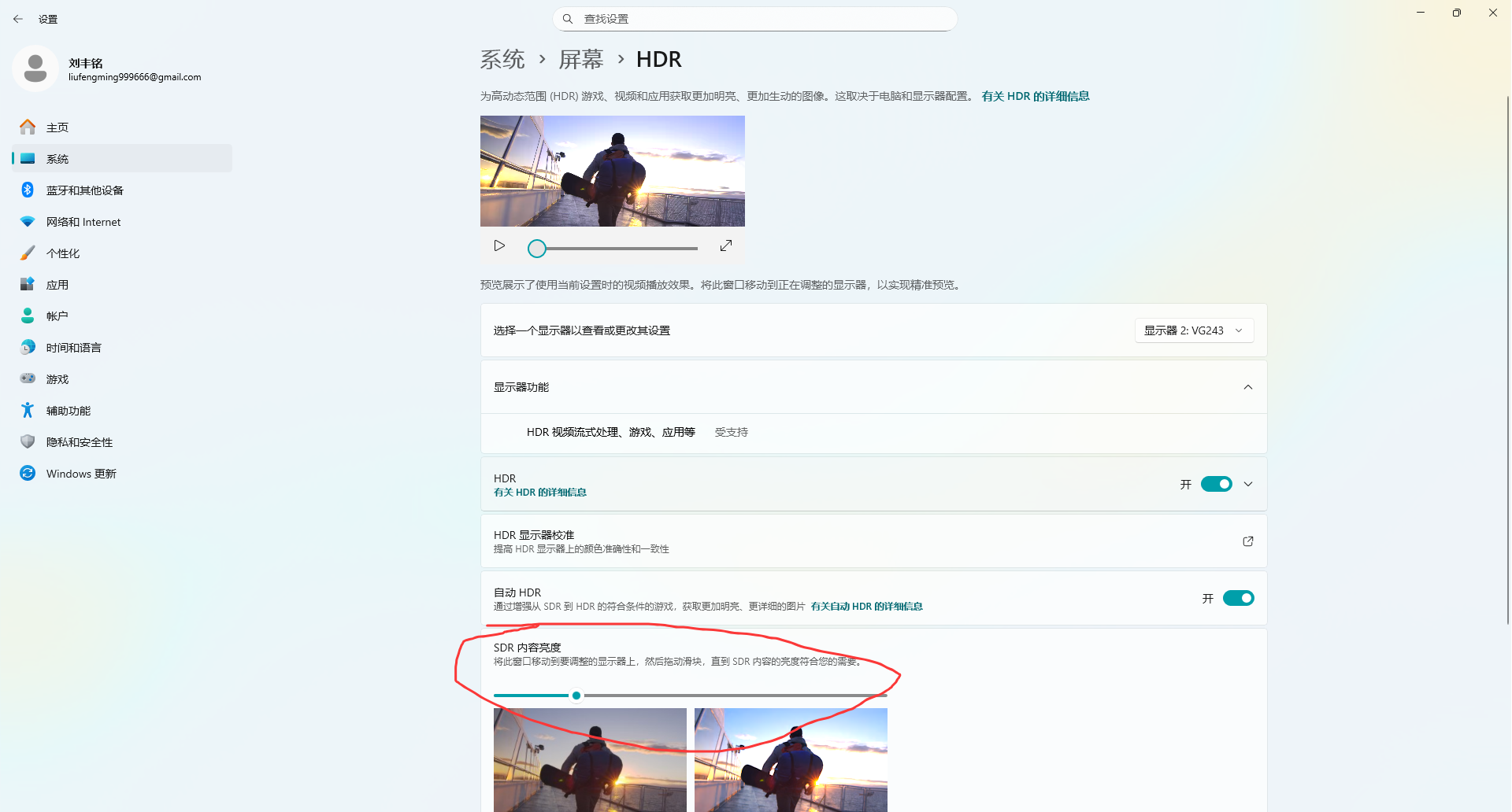 ④拖动【SDR内容亮度】条,即可改变显示屏亮度!
