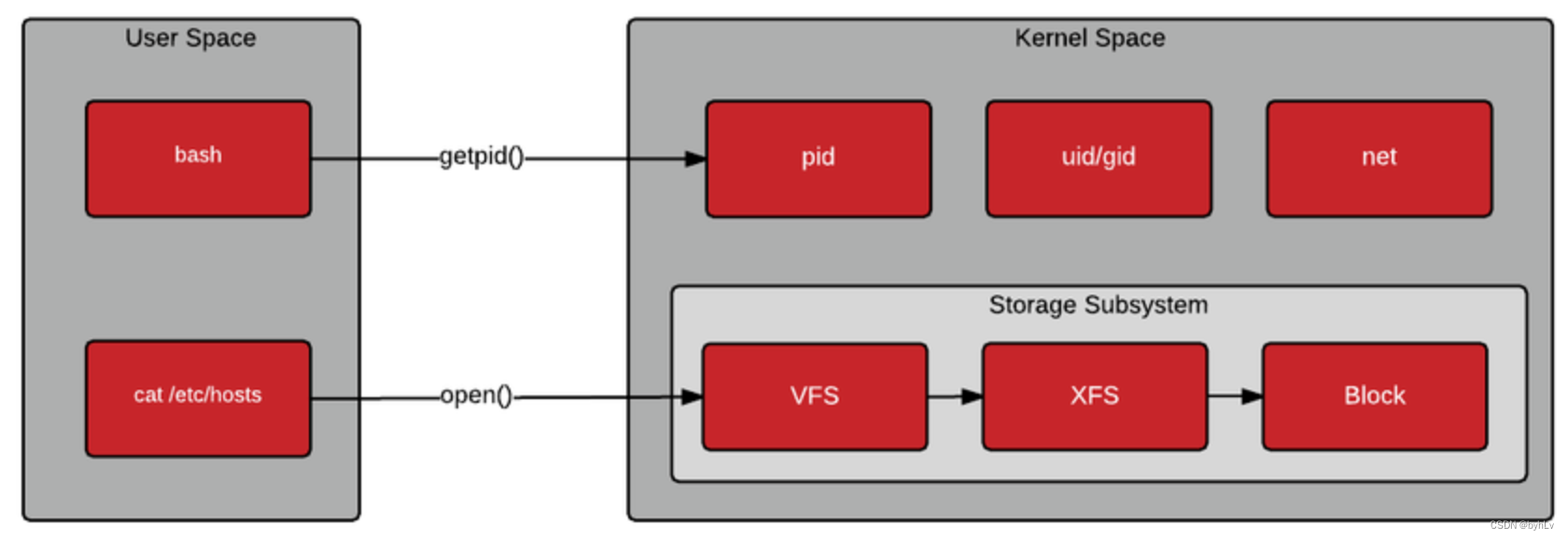 扩展:学习Linux时,经常可以看到两个词:User space(用户空间)和 Kernel space(内核空间)。简单说,Kernel space 是 Linux 内核的运行空间,User space 是用户程序的运行空间。为了安全,它们是隔离的,即使用户的程序崩溃了,内核也不受影响。