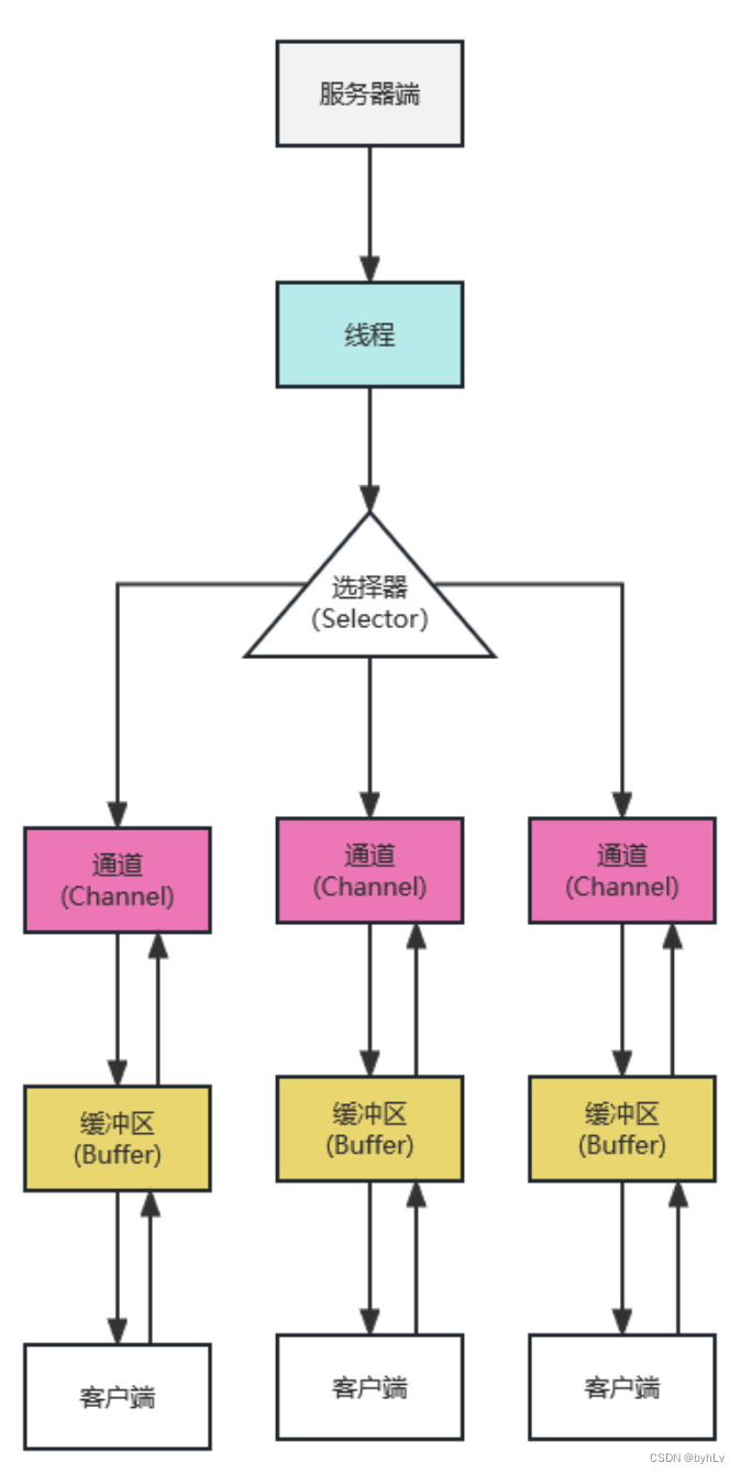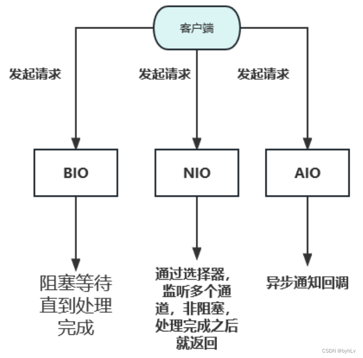 NIO:从客户端发起请求,通过选择器监听多个通道,非阻塞处理完成后就返回。