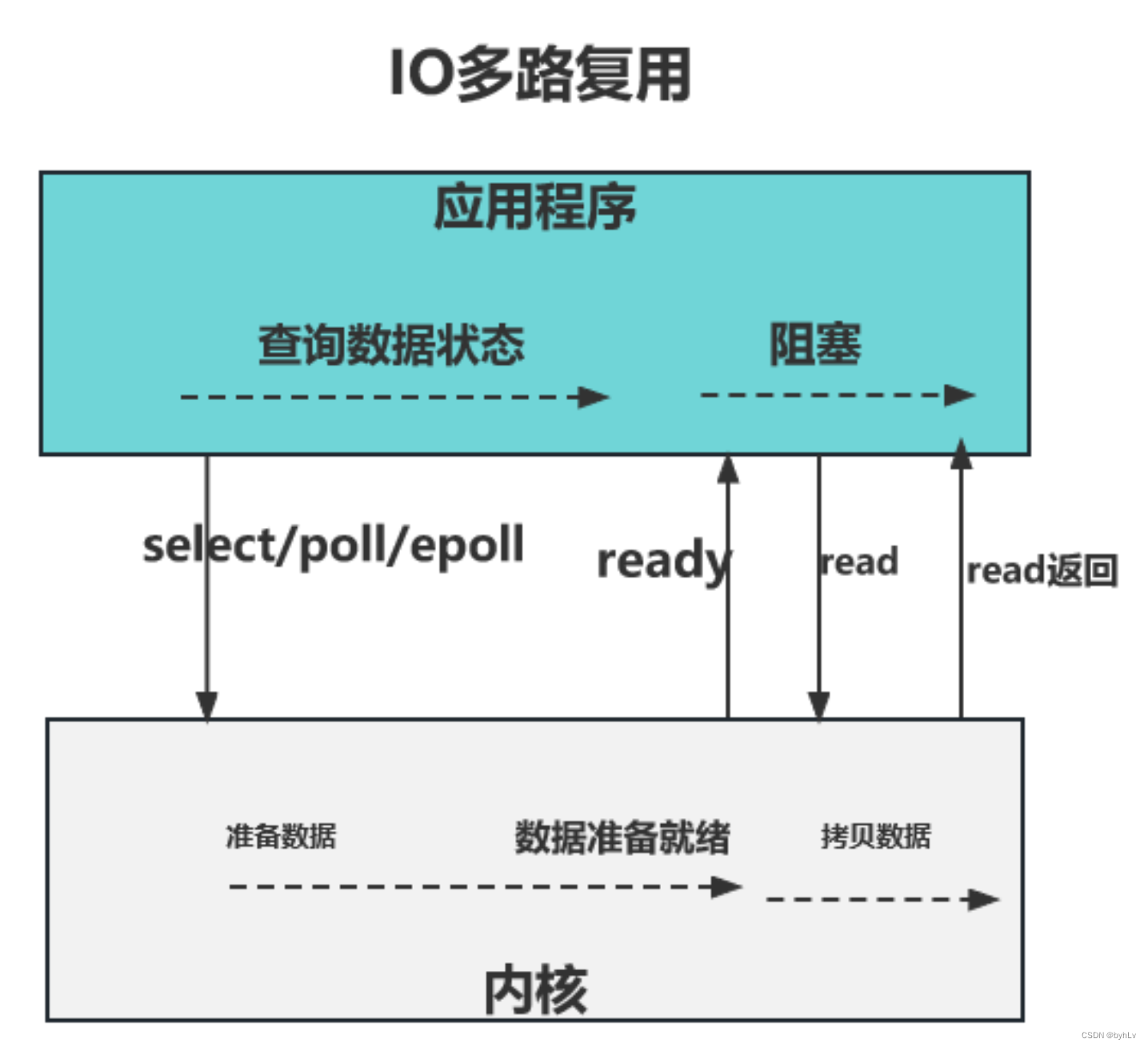 IO 多路复用模型中,线程首先发起 select 调用,询问内核数据是否准备就绪,等内核把数据准备好了,用户线程再发起 read 调用。read 调用的过程(数据从内核空间 -> 用户空间)还是阻的。
