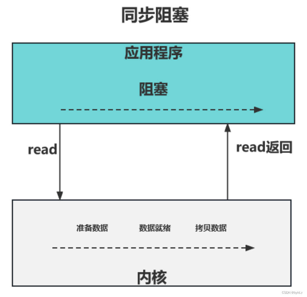 同步阻塞 IO 模型中,应用程序发起 read 调用后,会一直阻塞,直到内核把数据拷贝到用户空间。