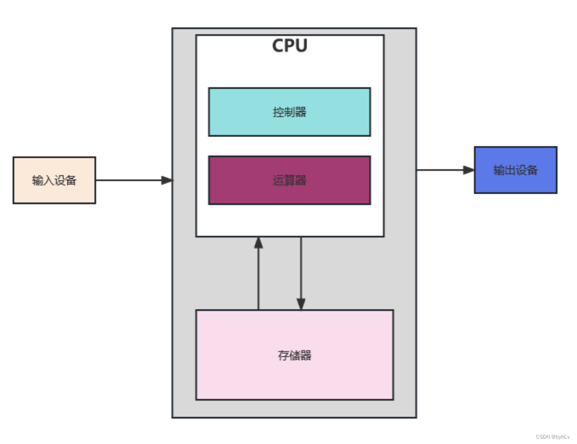 根据冯.诺依曼结构,计算机结构分为 5 大部分:运算器、控制器、存储器、输入设备、输出设备。