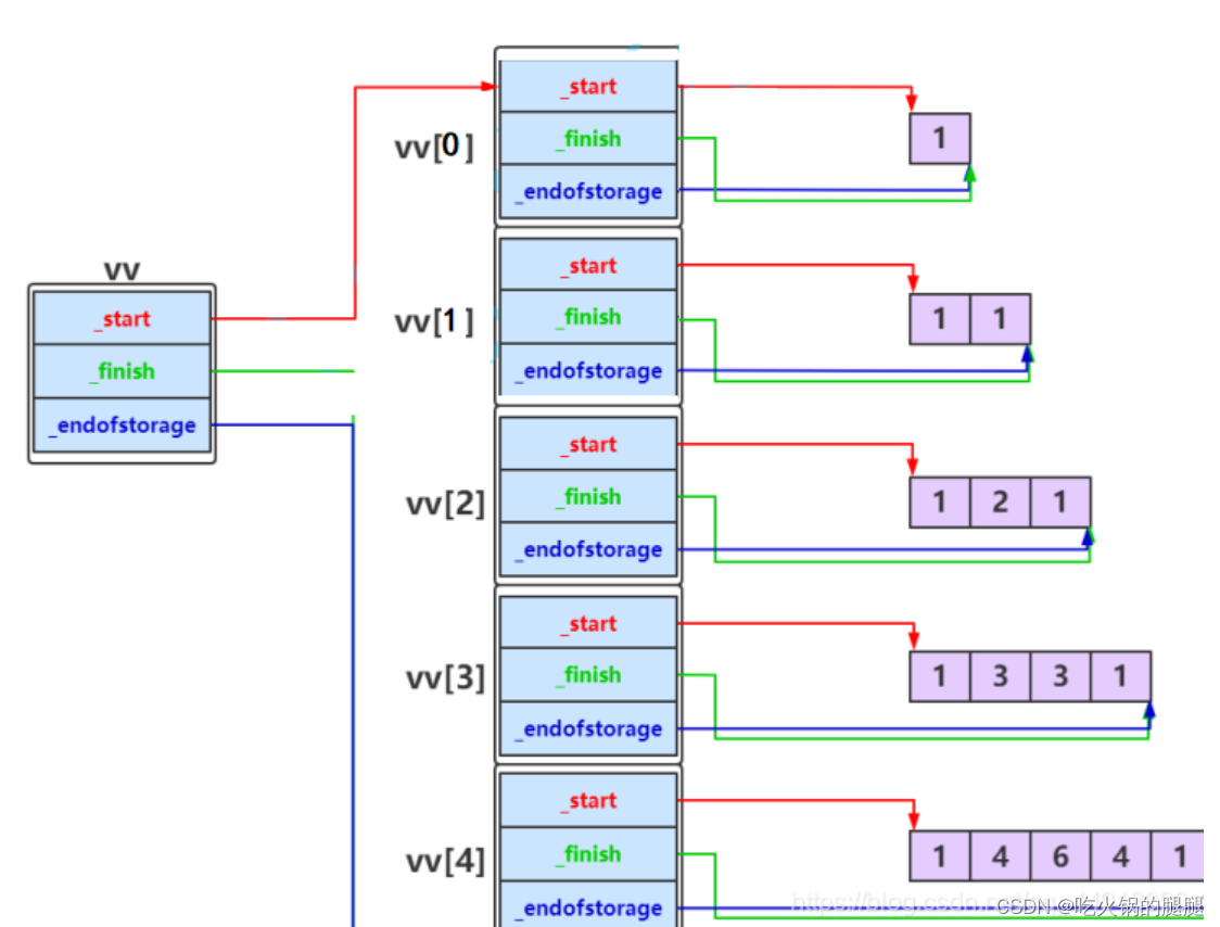 song::vector<song::vector> vv(n); 构造一个vv动态二维数组,vv中总共有n个元素,每个元素都是vector类型的,每行没有包含任何元素,如果n为5时如下所示