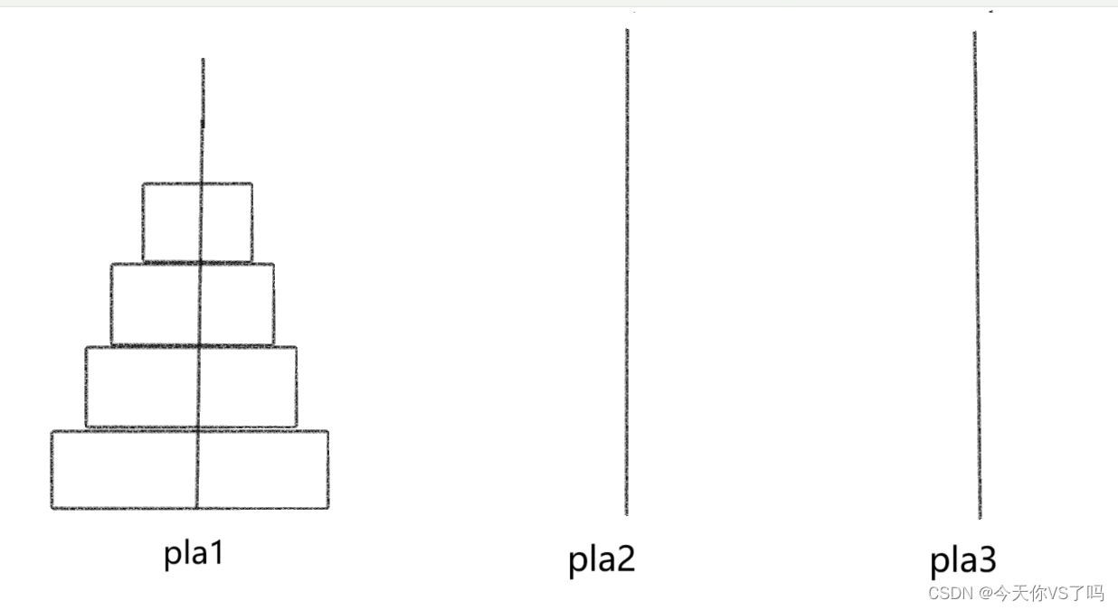 C语言递归之汉诺塔 操作规则:每次只能移动一个盘子,并且在移动过程中三根杆上都始终保持大盘在下,小盘在上,操作过程中盘子可以置于A、B、C任一杆上。当盘子数量为3时,pla1>>3,pla1>>2,pla3>>2,pla1>>3,pla2>>1,pla2>>3,pla1>>3共移动七次。当盘子数量为3时,A>>C A>>B C>>B A>>C B>>A B>>C A>>C。当盘子数量为2时,需要将pla1>>2,pla1>>3,pla2>>3共移动三次。当盘子数量为2时,A>>B A>>C B>>C。