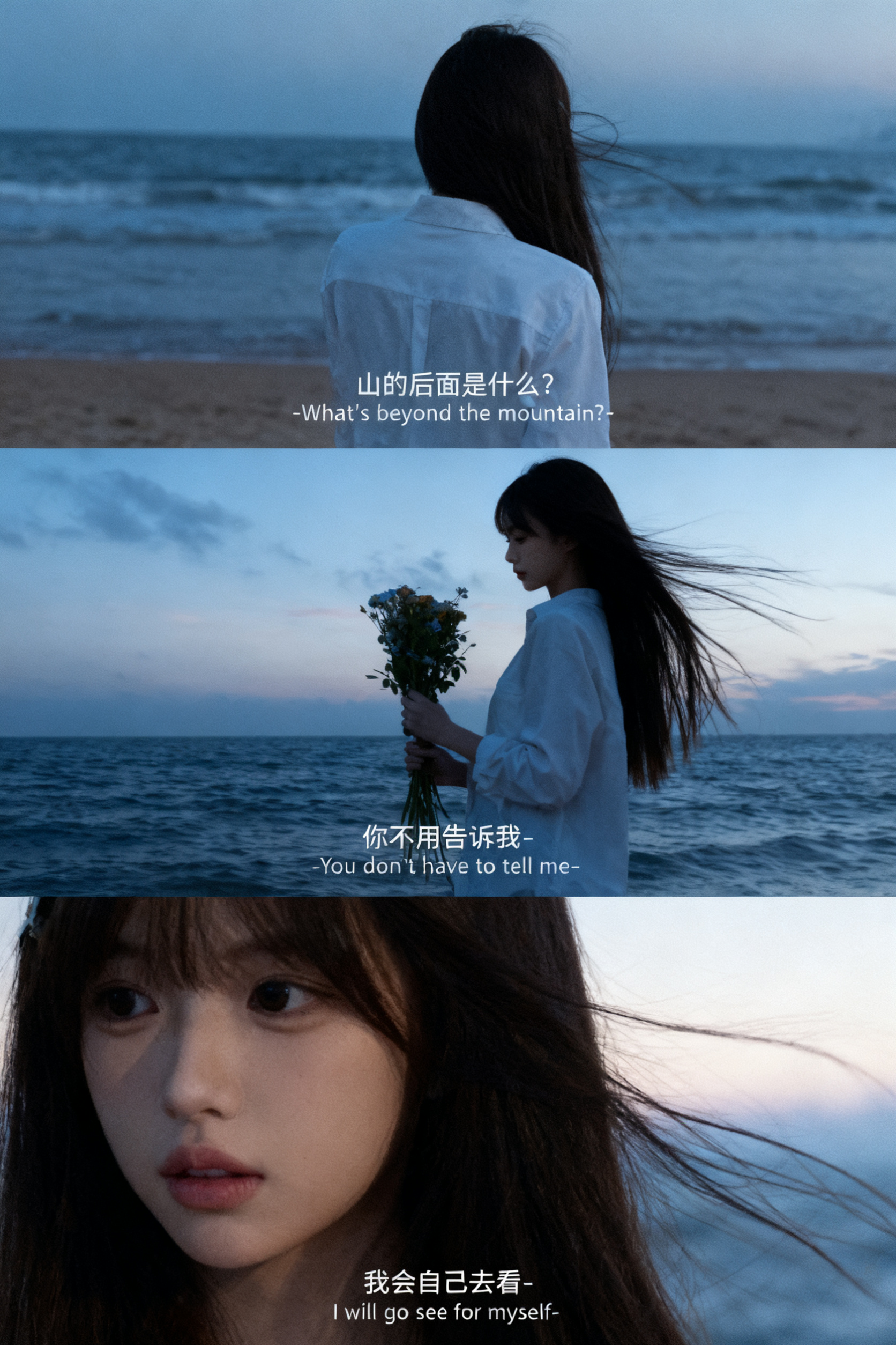 图2提示词:【帮我生成图片,一组三宫格胶片质感艺术感图,场景为海边 沙滩、天空、傍晚。图中人物和参考图一致,人物和面部不变,衣服为白色衬衣。 第一张为近景,上半身背影,风吹起头发,发丝凌乱,添加 中英字幕"山的后面是什么?-What'sbeyondthe mountain?-';第二张为中景,人物手持一束花束,侧身站立 于海边,看向手中的花,风吹起头 发,发丝凌乱,添加中英字幕"你不用告诉我-Youdon't have to tell me- "; 第三张为大特写,人物脸部位于画面偏左侧,风吹起头发 发丝凌乱,添加中英字幕"我会自己去看-Iwillgoseefor myself-"。 整体色调清冷,带有富士胶片效果,过度曝光,画面粗且 色调偏冷,暗部细节保留完整,高光区域呈现自然晕化、均 采用2柔和漫射光,无明显硬边阴影,营造出文艺且充满自 我探索情绪的氛围,生成的三张图按顺序合成一个三宫格, 字幕位于底部居中,比例2:3,最终只需要一张三宫格的图】