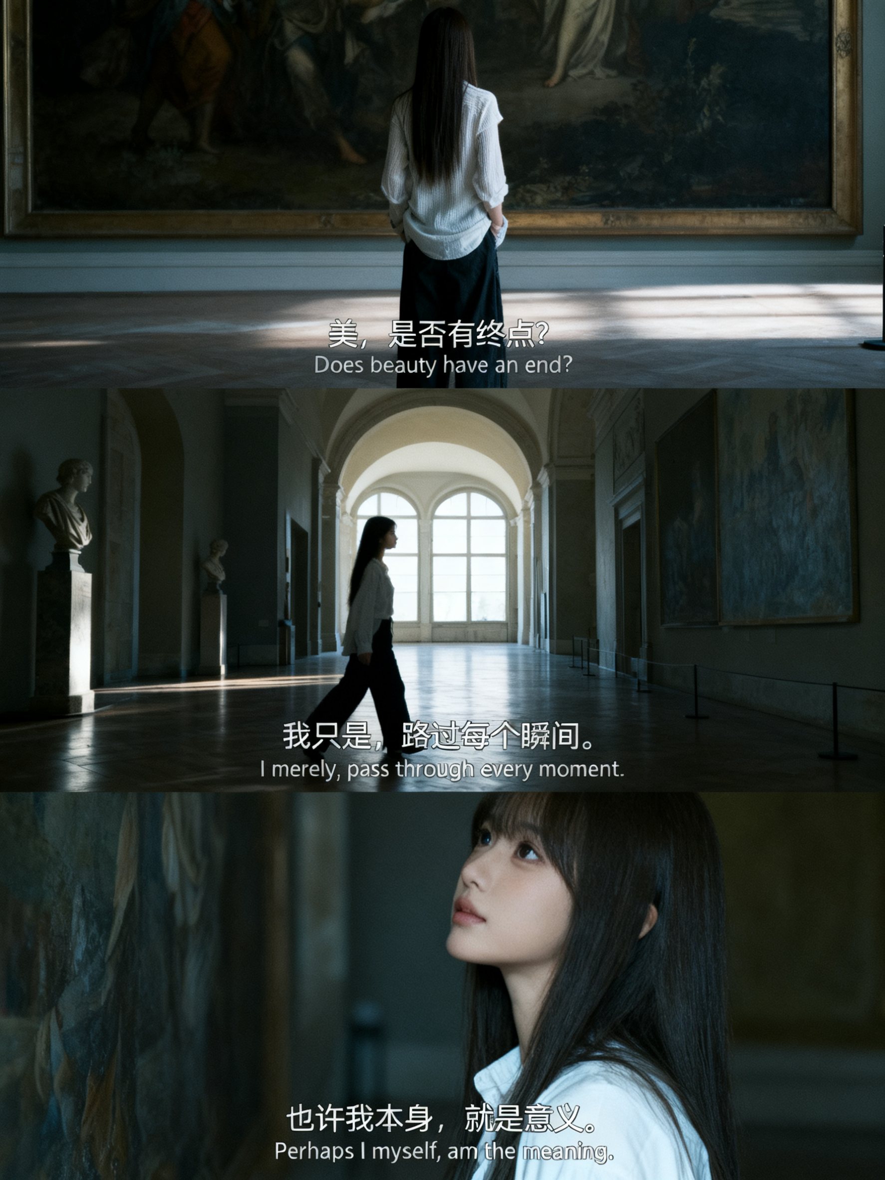图四提示词:一张以图片人像为主角的三宫格胶片质感艺术感写真图,场景为古典美术馆的空旷走廊,早晨或傍晚,光线透过拱形窗户洒在地板上。衣服为简约款的白色针织衫或衬衫。第一张为近景,上半身背影,人物站在一幅巨型画作前,双手插兜,背影显得修长而有艺术气息,添加中英字幕“美,是否有终点?Does beauty have an end?”第二张为中景,人物侧身走在长廊上,目光落在墙壁上的雕塑或另一幅画上,光影勾勒出侧脸的轮廓,优雅而富有吸引力,添加中英字幕“我只是,路过每个瞬间。I merely, pass through every moment.”第三张为大特写,人物脸部位于画面偏左侧,微抬下巴,眼神略带疑惑却又充满好奇,仿佛在与艺术品对话,展现出一种知性的帅气,添加中英字幕“也许我本身,就是意义。Perhaps I myself, am the meaning.”整体色调清冷,带有富士胶片效果,过度曝光,画面粗粝且色调偏冷,暗部细节保留完整,高光区域呈现自然晕化、均采用柔和漫射光,无明显硬边阴影,营造出文艺且充满探索与沉静的氛围,三张图合成一个三宫格,字幕位于底部居中