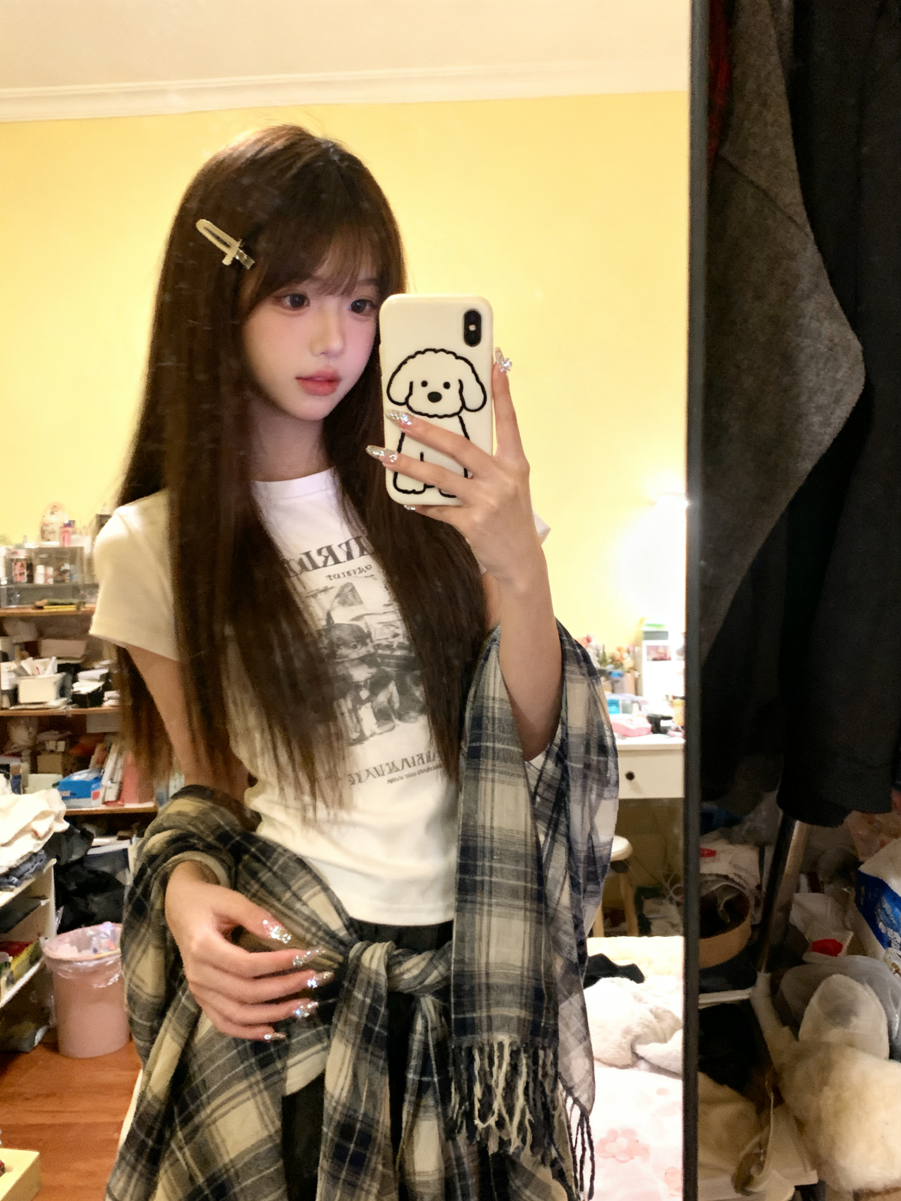 图1提示词:【拍摄一张清新写实风格的照片,场景是略显拥挤的房间,落地镜旁有一个长发及腰、如洋娃娃般可爱的女生,头戴卡子,身穿意式T恤和披肩格子衣服,衣服轻薄且层次感强,长美甲在闪光灯下闪耀,手持线条小狗手机壳对镜自拍,画面因快门速度产生运动模糊,采用半身视角,展现女生整体姿态,以暖黄色调营造温馨氛围】