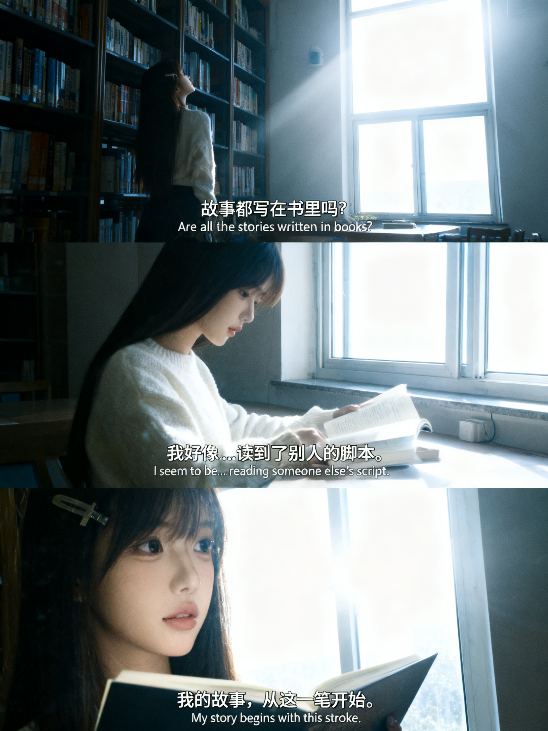 图三提示词:一张以图片人像为主角的三宫格胶片质感艺术感写真图,场景为清晨安静的图书馆,阳光从高窗斜射进来。衣服为简单的白色毛衣。第一张为近景,上半身背影,人物站在高大的书架前,仰头寻找一本书,添加中英字幕“故事都写在书里吗?Are all the stories written in books?”第二张为中景,人物侧身坐在窗边的桌前,阳光照在翻开的书页上,低头看书,添加中英字幕“我好像…读到了别人的脚本。I seem to be... reading someone else's script.”第三张为大特写,人物脸部位于画面偏左侧,合上书本,眼神平静地望向窗外的光,添加中英字幕“我的故事,从这一笔开始。My story begins with this stroke.”整体色调清冷,带有富士胶片效果,过度曝光,画面粗粝且色调偏冷,暗部细节保留完整,高光区域呈现自然晕化、均采用柔和漫射光,无明显硬边阴影,营造出文艺且充满自我探索情绪的氛围,三张图合成一个三宫格,字幕位于底部居