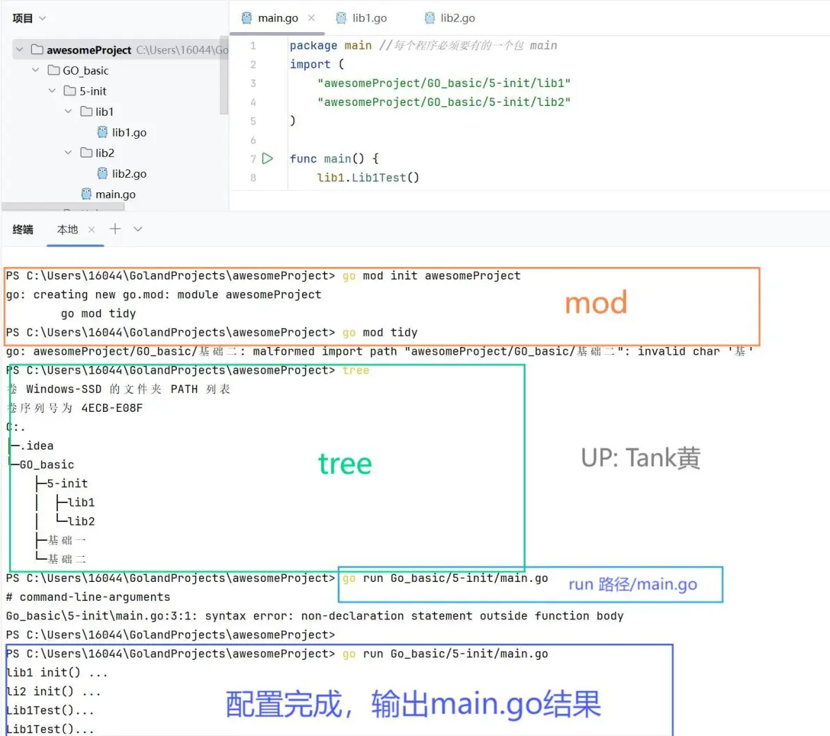 然后,我们输入【go mod init 主文件夹名】 和 【go mod tidy】,输入完成后再输入【tree】展现项目结构和【go run 路径/main.go】检查是否mod环境已配置完成,如下图所示。(注意,go run后输出main.go的结果才算环境配置完成)