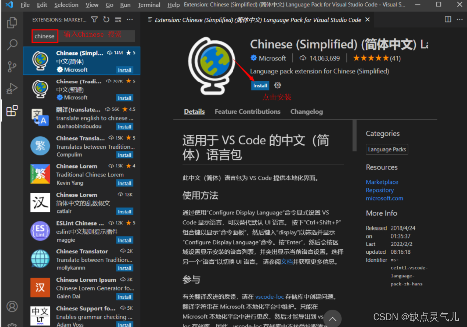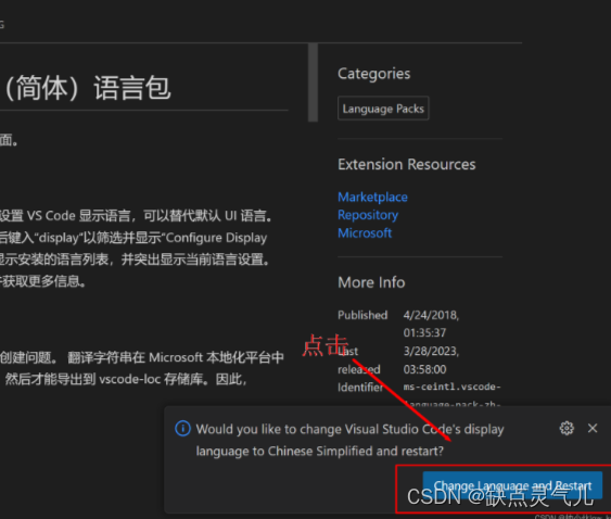 安装完后单击右下角的【Change Language and Restart】重启VScode软件,刷新一下就变成中文简体了。