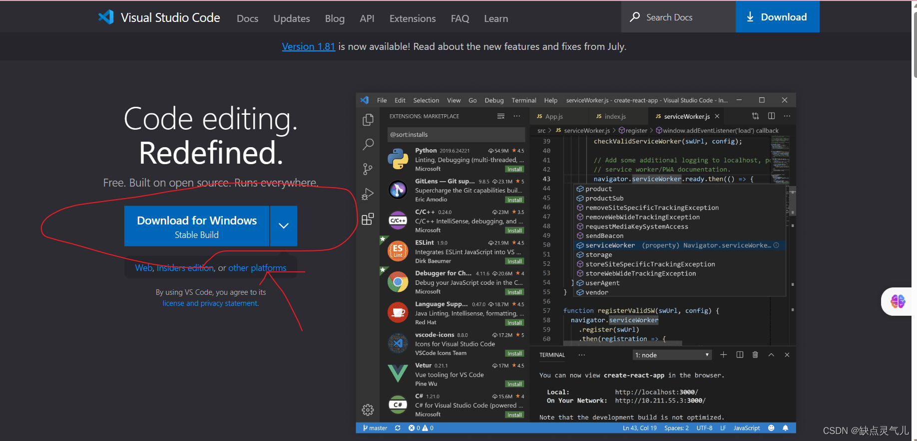 官网地址:Visual Studio Code - Code Editing. Redefined