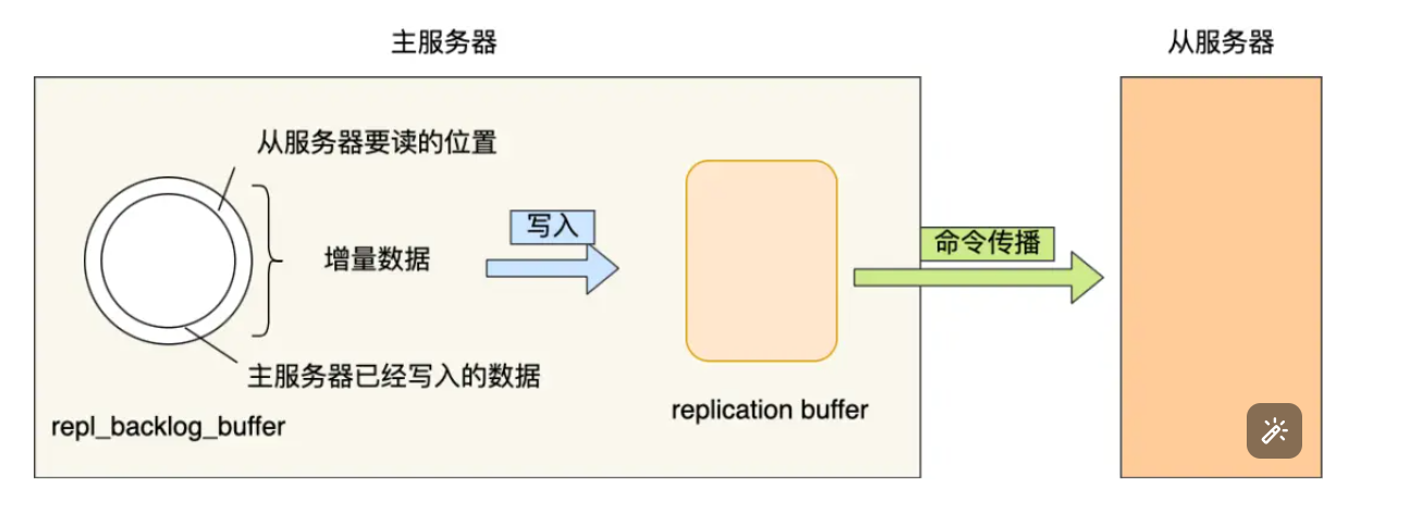 主节点在执行命令时,会将写命令写入repl_backlog_buffer(环形缓冲区)。主节点通过master_repl_offset标记写入位置,从节点通过slave_repl_offset标记读取位置。