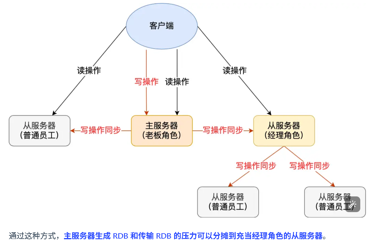 为了避免主节点压力过大,可以为从节点再建立从节点,从节点会将数据同步给从从节点。这有助于分担主节点的压力,避免阻塞主线程。