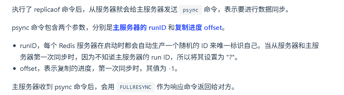 从节点需要输入主节点的密码,执行replicaof 主节点IP 端口号命令以建立连接。主节点与从节点在同步时,主节点会发送psync ? -1,从节点会发送主节点ID和偏移量(offset),以确定同步进度。 -