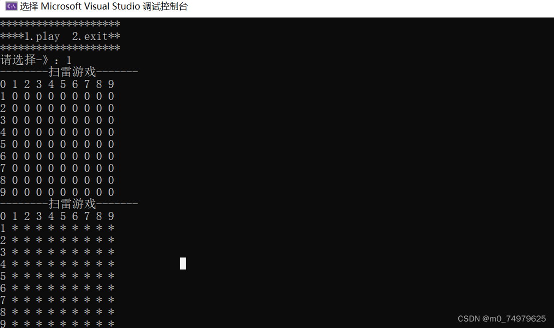 棋盘的初始化:这里我们定义了两个数组,一个(mine)是存放雷的信息,一个是(show)显示给用户排雷结果的信息。