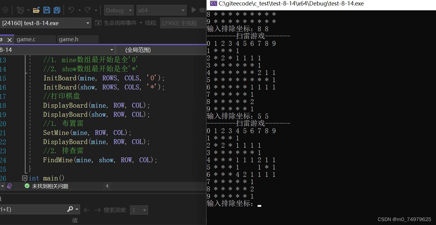 排雷:我们输入二维数组的下标,然后对进行判断存放的是地雷或者不是地雷,如果是地雷就被炸死了。如果不是地雷就判断周围有几个地雷,然后把地雷的数量存放到(show)数组的相应的位置。最重要的还有一个展开的函数,如果这个位置不是地雷同时这个位置周围也没地雷,那我们就把(show)数组的这个位置及周围位置都设置为空格,如果展开的位置周围有地雷那就把周围地雷的数量存放到这个位置,当然展开这里我们用递归实现。