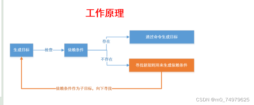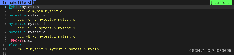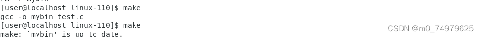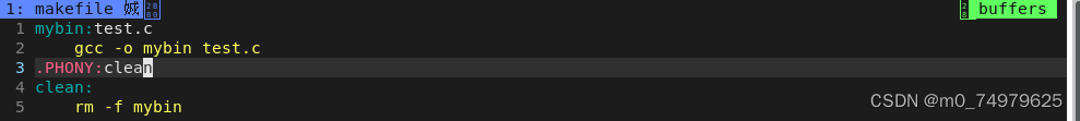 目标文件是mybin,依赖条件是test.c,mybin和test.c 之间是依赖关系, 依赖方法是 gcc -o mybin test.c。简单理解为要生成目标文件,就先有test.c文件,然后在执行依赖方法,形成目标文件mybin. (多个依赖关系用空格隔开)