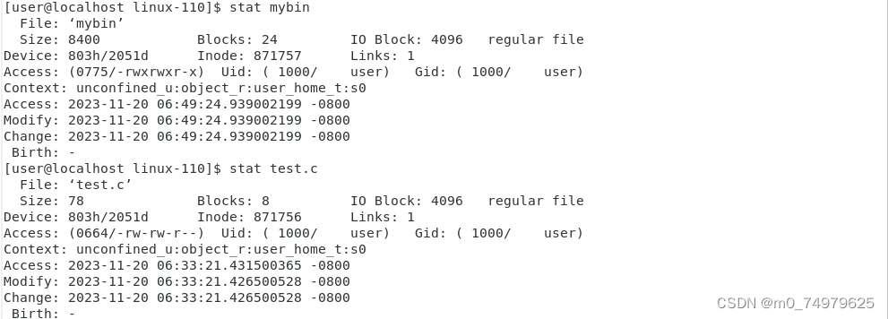 命令:stat 查看文件的状态。Modify记录文件的内容状态,Change是文件的属性