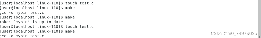 make第一次对源文件编译链接形成可执行程序,如果第二次make,它不会再去执行,需要更新源文件内容