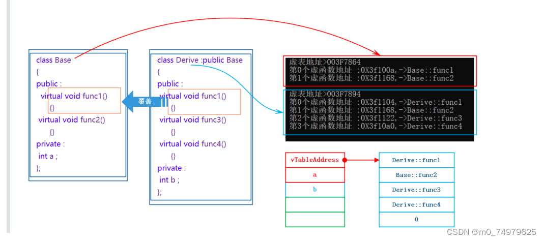例如,子类(Derive)和父类(Base)各有一个虚函数表的指针,子类继承父类的时候会把父类的虚基表拷贝一份到自己的虚函数表中,如果父类某个虚函数被子类重写了,那么子类的虚函数表就把父类的虚函数地址覆盖 成子类的重写的,如果父类的指针或者引用指向子类。子类对象的地址前四个字节是虚函数表的地址,由于切割的原理这时看到是父类的部分,由与子类重写了func1,原来子类虚函数表中拷贝父类func1函数的地址已经子类重写的func1覆盖,子类虚函数表(地址003F7894)调用func1,这个时候调用的就是子类的func1,而不是父类的。