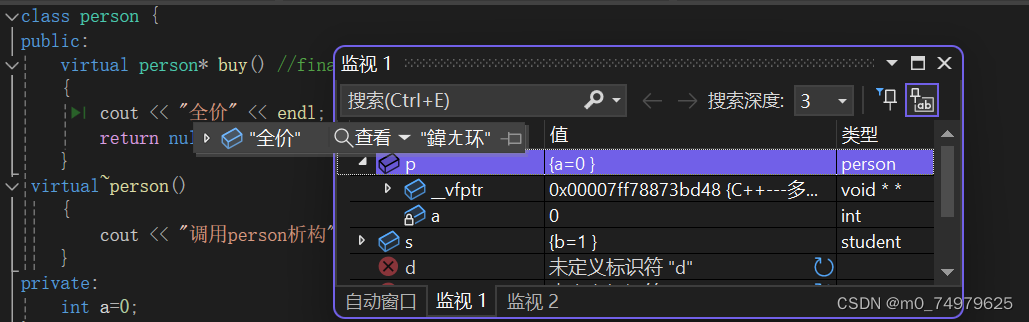 多态调用是运行阶段通过虚函数表中的调用函数,实现多态。我们发现,person p成员有个a,但是通过监视窗口看还有一个指针_vfptr.指向的是一个函数指针数组,这个是实现多态。