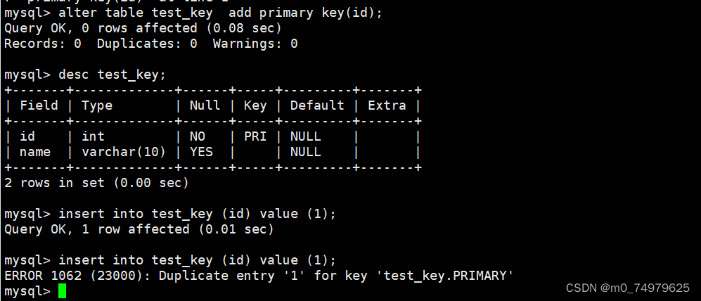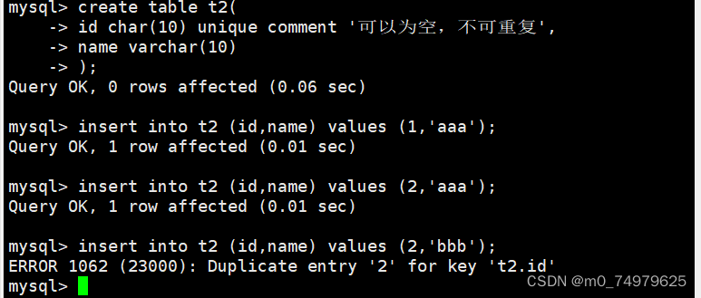 以下例子,设置了id和name构成主键,由于唯一性,再次插入就触发。