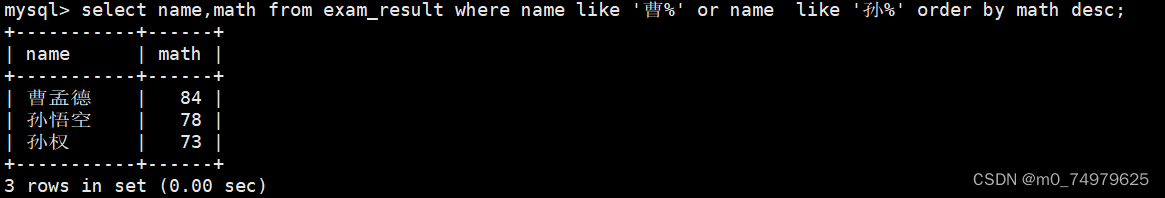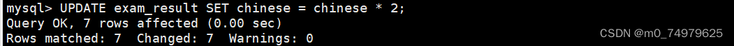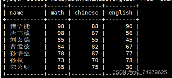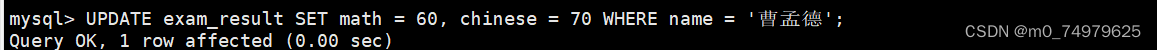 修改孙悟空的数学成绩,带上where条件筛选,不然所有的数学成绩都被修改了。需要注意的是等号的右边是表达式,不支持c语言:math+=1000这样的。