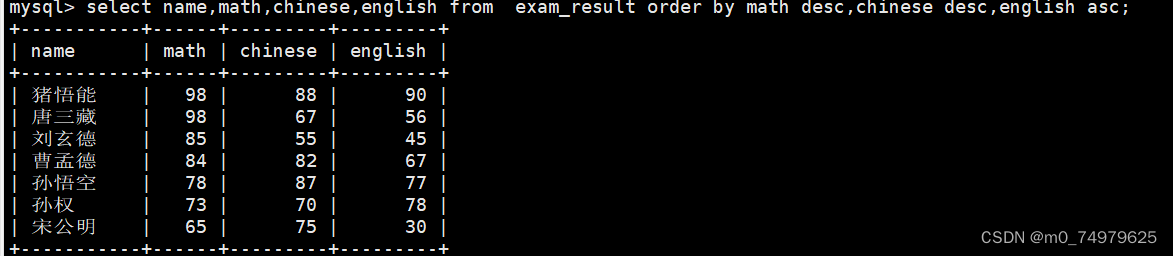 例子:数学降序,语文降序,英语升序