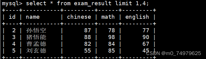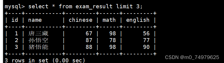 SELECT ... FROM table_name [WHERE ...] [ORDER BY ...] LIMIT s, n -- 从 0 开始,筛选 n 条结果 SELECT ... FROM table_name [WHERE ...] [ORDER BY ...] LIMIT n; -- 从 s 开始,筛选 n 条结果,比第二种用法更明确,建议使用SELECT ... FROM table_name [WHERE ...] [ORDER BY ...] LIMIT n OFFSET s;