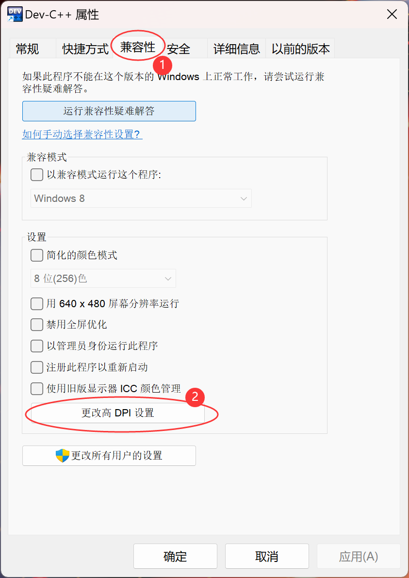 2. 在属性中,点击【兼容性】,在兼容性中,点击【更改高DPI设置】