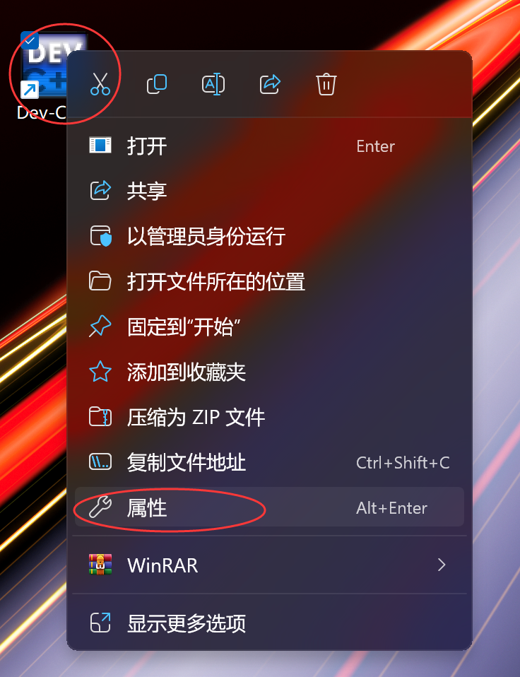 1. 找到DevC++的桌面图标,右击点击属性,如下图: