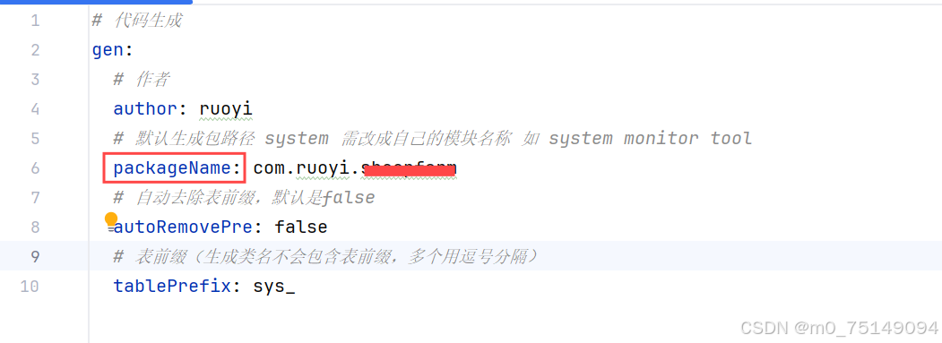 在ruoyi-vue\ruoyi-generator\src\main\resources\generator.yml中将packageName改为自己的模块,便于后续代码部署