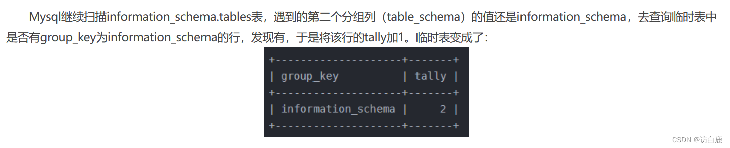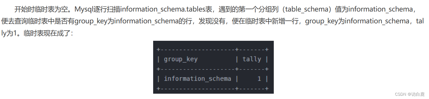 我们猜测在做这样的统计时,Mysql会建立一张临时表,有 group_key 和 tally 两个字段,其中 group_key 设置了 UNIQUE(唯一)约束,即不能有两行的 group_key 列的数据值相同。