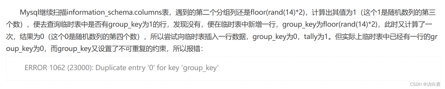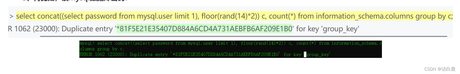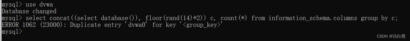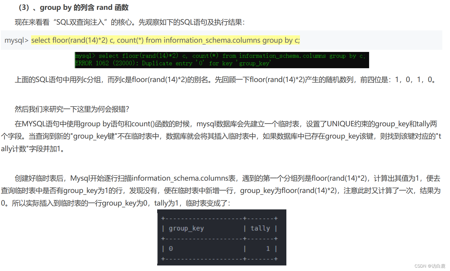 对于双查询注入,需要先了解“count()、rand()、floor()、concat()”这三个函数的功能以及group by语句的用法。