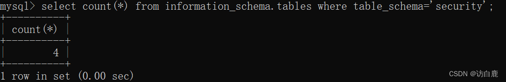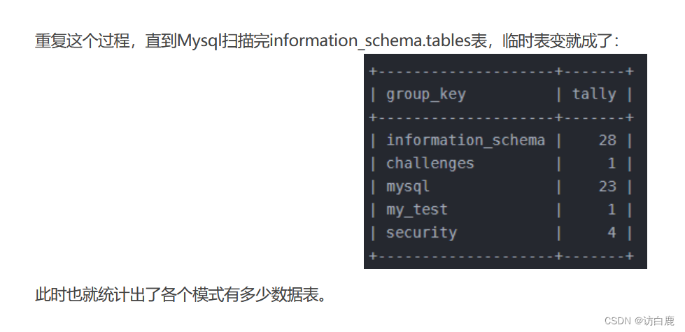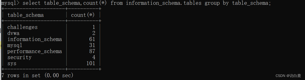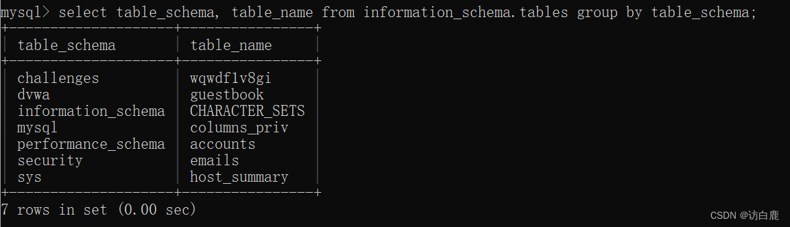 这里用了group by table_schema,用数据库名来对查询的结果进行分组,所以只显示了不重复的数据库,而在同一个数据库只显示其第一个表名。