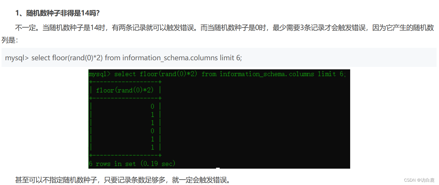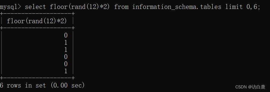 select floor(rand(12)*2) from information_schema.tables limit 0,6;